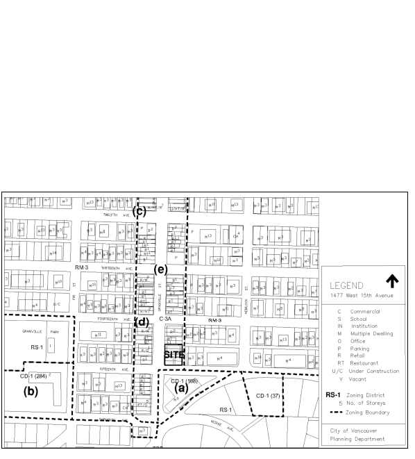 (This is an extract from staff committee report to the Development Permit Board meeting of May 26, 2003, at which time the DBP approved the Development Application with conditions.)As part of the development permit process, the applicant provided confirmation that two signs had been erected on the site. On March 10, 2003, City staff mailed letters to 331 adjacent property owners, advising them of the Development Permit application under consideration. A total of 18 individuals responded in writing to the first notification: two were in favour of the application, 14 voiced opposition, and three offered feedback but did not support or oppose the application. The concerns noted were traffic congestion at West 15th and Granville; parking issues in the lane east of Granville Street; building heights and resultant view losses; and the potential for the loss of small-format retail that met local needs. Four respondents questioned the heritage merits of the redevelopment in light of the one-story additions with a different architectural treatment. Additionally, a local business submitted a petition with 52 signatures indicating opposition to the application on the grounds that their operations would be displaced.