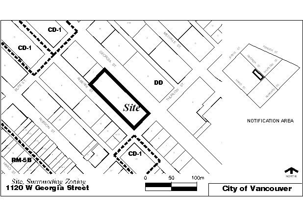 Site and Context: This large downtown site is situated on the eastern part of a long block at the corner of West Georgia Street and Thurlow Street (see Figure 1). The site also fronts Alberni Street. Bute Street is to the west. Surrounding the site are several significant buildings including the former MacMillan-Bloedel Building, the Terasen Building (formerly BC Gas), an office tower at the western end of the block, an office tower and a residential tower (The Carmana) on Alberni Street, and the mixed-use, commercial-residential building (The Carlyle) at the south-east corner of Alberni and Thurlow Streets.