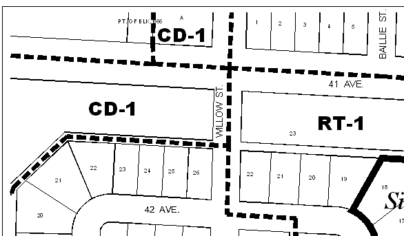 Site, Surrounding Zoning and Development: This irregular-shaped 3117.4 m² (33,556.5 sq. ft.) site is comprised of 2 parcels on the north-east side of 42nd Avenue and Tisdall Street. The site has a frontage of 35.3 m (116 ft.) and a depth along the common property line between the two parcels of 61.7 m (202.5 ft.).