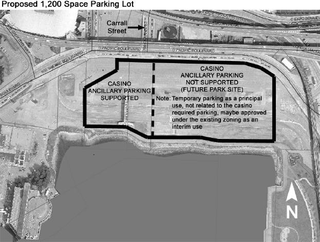 It is projected that the casino can meet something greater than the minimum parking required to service the casino on the lands to the west of the park site, but not the proposed maximum permitted parking. Alternative sites in the vicinity could be accessed to maximize the ancillary parking, preferably on other future development sites and preferably those already developed for interim parking.