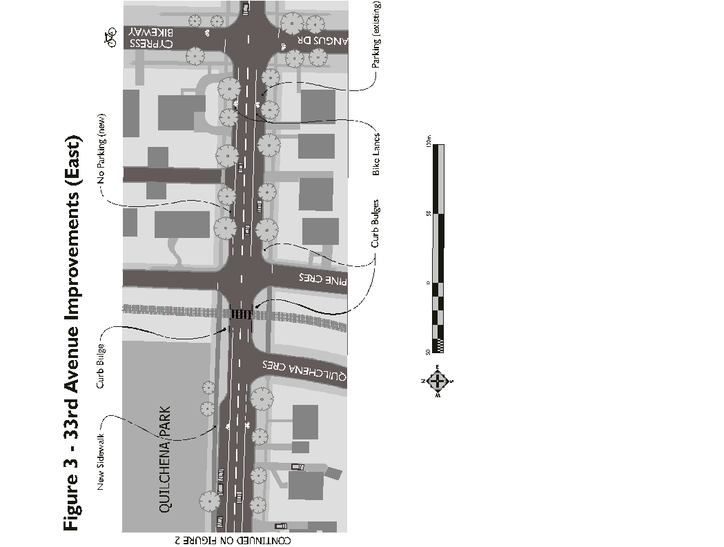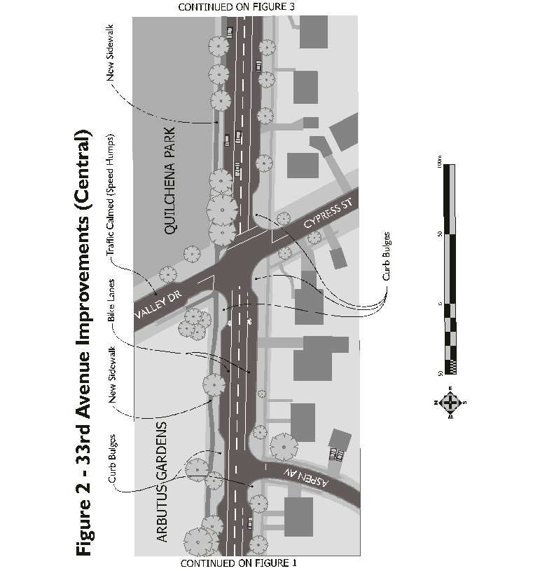 · approval and funding of neighbourhood traffic calming and cycling improvements.The changes recommended for West 33rd include the addition of new sidewalks, bike lanes and traffic calming, improvements to parking and repairs to existing pavement. This plan was developed by staff and reflects input from local residents, Park Board and the developer of Arbutus Gardens.