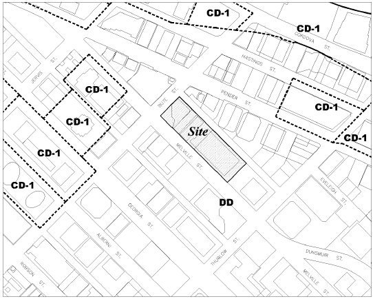 The site is located at the northeast corner of Bute and Melville Streets, and includes the site of the existing 10-storey office/residential/parkade building at 1133 Melville Street which will be retained and upgraded (see Figure 1). Surrounding the site are several significant buildings including a residential tower and office tower across Melville Street (The Orca and Orca Office Tower). Further west on Melville is another residential tower (Point Claire) and south on Bute at Georgia are several residential towers (Venus and The Residences on Georgia).