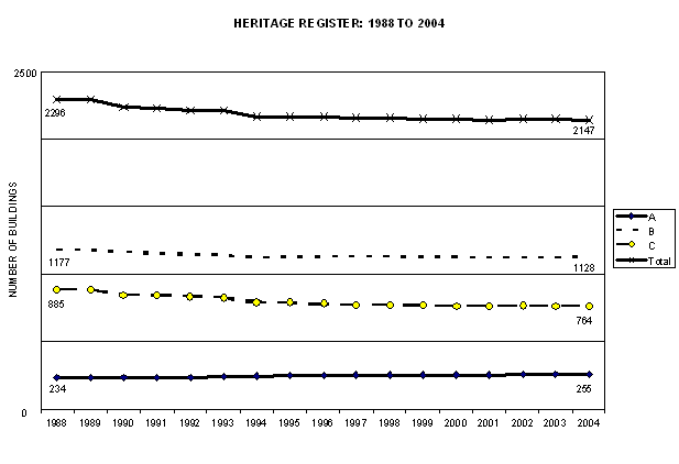 The Heritage Register was established by Council in 1986 (then known as the Heritage Inventory). Between 1986 and 1988 there was a policy revision which affected the number of C-listings. Since 1988, the net number of buildings on the Heritage Register has declined by 149 (-6.5%). By category, the net changes are as follows: A-listings, +21 (+9.0%); B-listings, -49 (-4.2%); C-listings, -121 (-13.7%). The increase in the number of A-listings is attributable in large part to additions of 16 Post-1940's Recent Landmarks in 1993 (11) and again in 1996 (5). The last deletion of an A-listed building occurred in 1994. The following graph summarizes the annual trends of the Heritage Register since 1988.