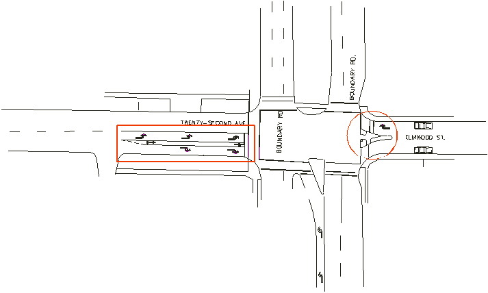 This project involves modifying the current diverter on the east side of Boundary Rd. at the intersection of 22nd / Elmwood/ Boundary in order to improve east/west bicycle access through the intersection. On the west side of Boundary a corresponding bike slot will guide cyclists safely to a loop detector at the intersection in order to activate a semi-actuated signal. See Figure 1. It is anticipated that further changes may be made in the future, such as installing bike lanes in place of the existing wide curb lanes on 22nd Ave.