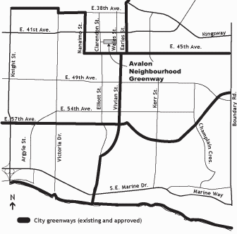 In 2002, Council adopted the VFK Community Vision which includes direction on greenways, the Avalon Dairy on Wales Street, and community involvement. The 43rd Avenue Neighbourhood Greenway Committee (43rd NGC), a subcommittee of the VFK CityPlan Committee, initiated the idea of the Avalon Neighbourhood Greenway and has been working with City staff for the last two years bringing their idea to fruition. Figure 1 contains a context map locating the Avalon Neighbourhood Greenway project within the Victoria-Fraserview/Killarney Neighbourhood.