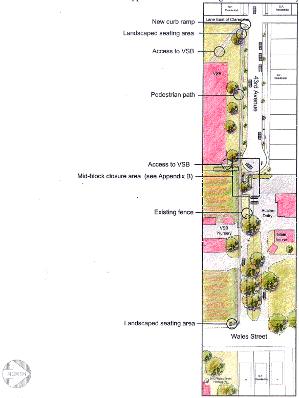 East 43rd Avenue between Clarendon and Wales is a street right of way, however there has never been vehicular through traffic due to a mid-block closure and this proposal will make no change to the existing traffic pattern. To the west of the mid-block closure, access to property is by street right-of-way and to the east of the mid-block closure there is lane access to Avalon Dairy and the Vancouver School Board (VSB) Nursery. Avalon Dairy also has direct vehicular access off Wales Street.Public Process