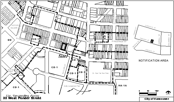The site is located in the Victory Square area, and zoned Downtown District (DD Area C). Located immediately west of the Chinatown Millennium Gate and former CPR rail right-of-way, and adjacent to the Silk Road pedestrian alignment, this block of West Pender Street, however, appears as a logical extension of the adjacent Chinatown District. Across the street from the site, to the south, is the 3- to 4-storey Tinseltown complex on lands zoned CD-1 for International Village. The land to the north and west of the site is zoned Downtown District (DD), and developed with a range of residential and commercial uses.