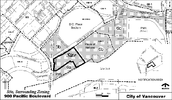 Survey plans submitted with the application indicate an approximate site area of 20 000 m² (215,285 sq. ft. or 4.94 acres) within Area 6A. NOTE: The previous site address, 728 Pacific Boulevard, was mistakenly identified. Because the site is "hooked" to a parcel east of the Plaza of Nations, which will be unhooked in forthcoming subdivision (now in process), it was given that parcel's lower street address number.Existing Zoning: The site is zoned BCPED, which permits a wide range of land uses, including residential and commercial, but it has no maximum floor space ratio (FSR) or maximum building height governing its development. It is an interim zoning which has been in place since February 1984, until CD-1 rezoning is completed for the site, as anticipated by the FCN ODP.
