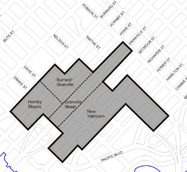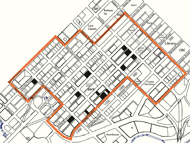 Figure 1 - The Downtown South neighbourhood areaAfter a staff and consultant review of the implications of considering increases in density on these smaller sites (See Figure Two) beyond that envisaged by zoning, it has been concluded the density and height of development on these small sites should generally be limited to no more than 3.0 FSR and 70 feet (21.4 m). Staff do expect that there will be practical opportunities to consider the transfer of the 10 per cent increase in heritage density as allowed by the zoning bringing the potential density to 3.3 FSR within the allowable height. Also, there will be some opportunities to consider the development of affordable housing projects within the allowances permitted by the zoning (i.e. 5 FSR and heights up to 120 feet [36.5 m]). In these cases, these density increases will have to be reviewed with consideration given to the design, livability, shadowing and other provisions of the Downtown South Guidelines and public input.
