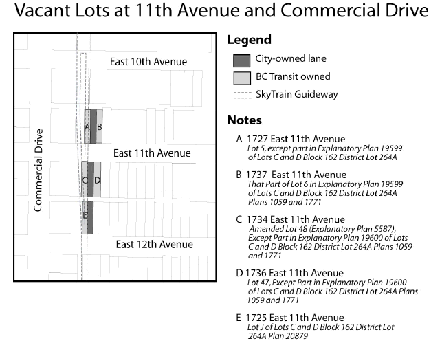 The three sites under discussion are comprised of 8 separate parcels; 5 are owned in fee simple by B.C. Transit and 3 are unopened dedicated City-owned lanes which were identified in the Street Use Agreement between the City and the Province for the Expo SkyTrain in the late 1980's. The sites have been vacant for decades; their current uses include acting as a short cut from East 12th Avenue to the Sky Train station and as a local garbage dumping location.