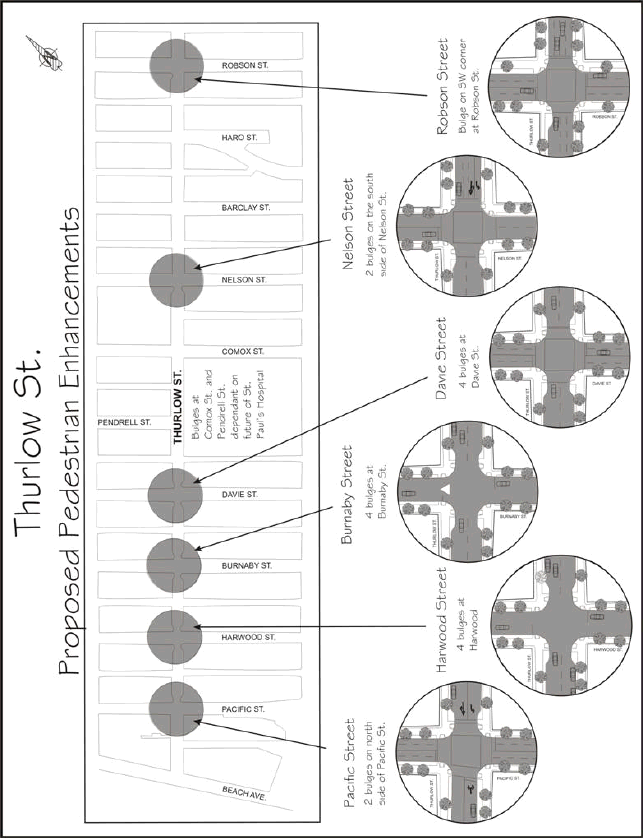 · Thurlow Street & Beach Avenue - to be considered as part of the proposed Beach Avenue bike facility.The intersection of Thurlow Street and Barclay Street was identified as a desirable location to provide enhanced pedestrian facilities due to the relatively high volumes of pedestrians crossing Thurlow Street. However only a small bulge on the western side of Thurlow Street could be constructed at this location, with limited benefit to pedestrians. Therefore, staff will continue to monitor this location for more suitable options to enhance the existing crossing of Thurlow Street.