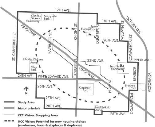 In July, 1998, Council approved the Kensington-Cedar Cottage (KCC) Community Vision which includes Directions that bring CityPlan to the local level. The Vision identified the four blocks along Kingsway between Inverness and Perry as a key shopping area for improvement, and the area around it for small-scale housing types such as row houses, four-and sixplexes, and duplexes.