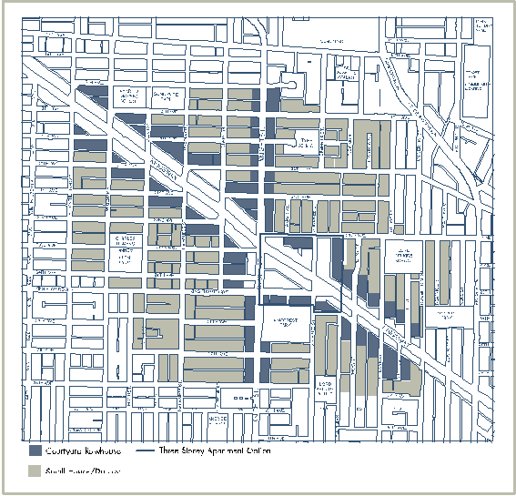 The Courtyard Rowhouse zone will create housing with two rows of side-by-side units, one near the street the other near the lane. It is proposed along Knight Street and behind the commercial mixed-use zone along Kingsway. The rest of the area is proposed to be Small House/Duplex. This zone will produce infills, "mini-houses" and/or duplexes in different combinations depending on whether the site comprises one, two, or three typical lots.