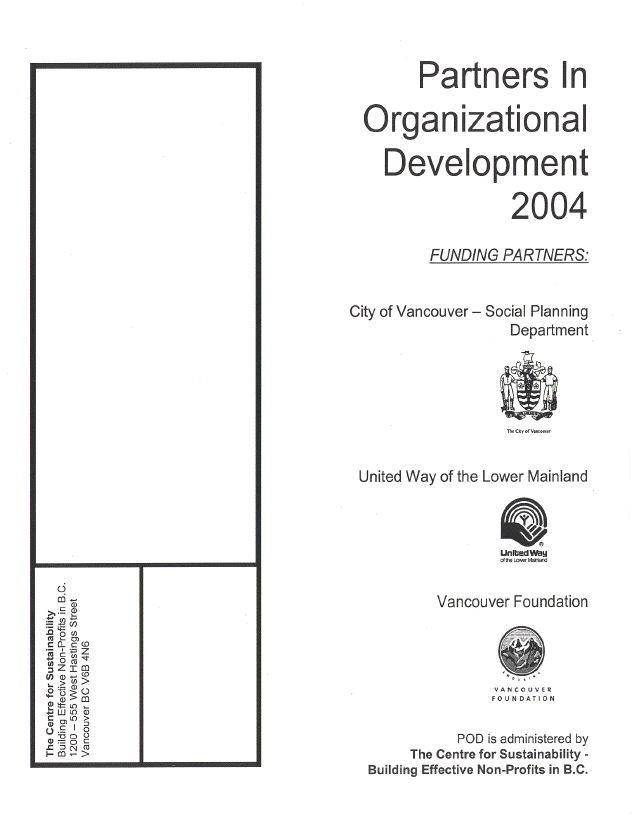 On March 9, 2004, Council approved an allocation from the Community Services Grants of $20,000 for the Partners in Organizational Development (POD). Partners in Organizational Development is a grant program initiated in 1989 as a partnership of the Vancouver Foundation, United Way of the Lower Mainland, the Department of the Secretary of State and the City of Vancouver. The aim of this grant program is to help non-profit groups deal with common organizational problems and thus to enable them to function more effectively. Other partners in past years have included Health Canada and the Ministry of Community, Aboriginal and Women's Services.