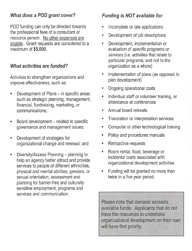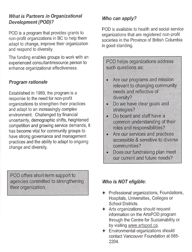 Partners in Organizational Development grants are exclusively for hiring a consultant to assist non-profit community services agencies with organizational development activities, including Board development, diversity and access planning, and development of plans such as strategic, fundraising, financial, communications, and marketing plans. A copy of the 2004 POD brochure describing the program, eligibility and evaluation criteria is attached as Appendix C. Proposals are assessed on the basis of completeness of the application, eligible activities and costs, documented need, a clear activity plan and the long-term benefit to the organization as a whole. The POD grants are reviewed by a committee of staff representing each funder.