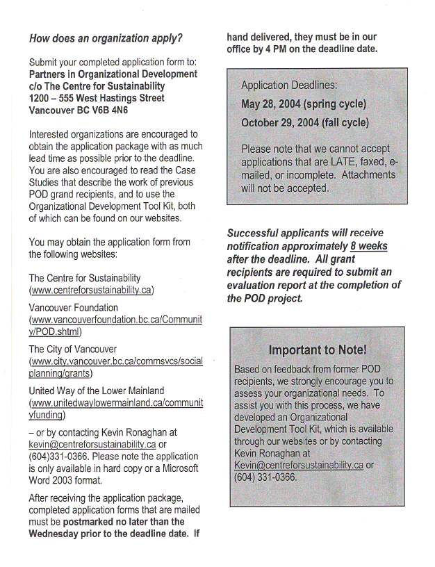 The 2004 POD program funding partners are: United Way of the Lower Mainland, Vancouver Foundation, and the City of Vancouver. This year, the administration of this grants program was transferred from United Way of the Lower Mainland to the Centre for Sustainability.