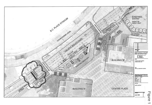 In order to satisfy the parking requirements, the applicant is securing the use of 189 surface parking spaces situated on Lot 5B, located north of Pacific Boulevard, just west of B.C. Place Stadium. An improved and signed walking route is being developed to direct users of this parking lot to a convenient crosswalk on Pacific Boulevard. Due to heavy traffic volumes on Pacific Boulevard, a signalized pedestrian crosswalk is required to ensure safety, especially given that many users will be crossing after dark. The crosswalk's proposed location is just west of the westerly pedestrian overpass [see Figure 1].