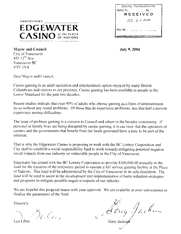 One of the Council-adopted conditions is Public benefits to the satisfaction of City Council. Accordingly, Council has received a letter from Mr. Len Libin and Mr. Gary Jackson, on behalf of the proposed casino at Plaza of Nations (Edgewater Casino), offering to create a Social Responsibility Fund intended to help mitigate some of the negative consequences associated with casino gaming. The offer includes the participation of the British Columbia Lottery Corporation (BCLC).