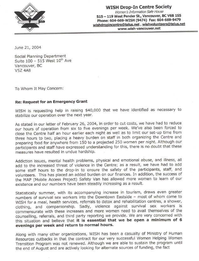 After extensive discussions with WISH and other funders, staff have confirmed that WISH has an immediate need for $40,000 in additional funding to stabilize its drop-in service and general operations over the year. (Appendix A - Letter). Staff are recommending an emergency grant of $10,000 which, if Council approves this amount being added to the Community Services Grants budget, would increase the City's annual support to WISH to $44,000. The other sources of funding include Status of Women Canada, the Provincial Ministry of Public Safety and Solicitor General, and the City's DTES program fund, which have agreed to provide one-time contributions totalling $30,000.WISH has been experiencing financial and organizational pressures which reached a crisis point early in 2004 and forced the Society to lay off staff and cut back on the hours of operation of its drop-in centre. Rather than recommending an increase to WISH's grant during the reconsideration process, staff recommended approval of City funding at last year's level, pending an assessment of WISH's organizational and funding needs.