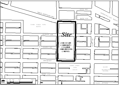 VCCs King Edward Campus occupies a rectangular 3.2ha (7.8 acre) area of land bordered by the 1100 Block of East Broadway to the south, Keith Drive to the east, Glen Drive to the west and Great Northern Way to the north. East 7th Avenue separates the campus into two full block parcels. The site and its context are illustrated on Figure 1: Site Context Plan.The King Edward Campus was opened in 1983 and has become the most heavily utilized major college campus in British Columbia. The campus currently operates courses for High School Completion and Upgrading, Adult Special Education as well as a variety of vocational training programs. In addition to providing teaching, study and research space for these programs the campus includes various complementary facilities such as a bookstore, cafeteria and daycare.