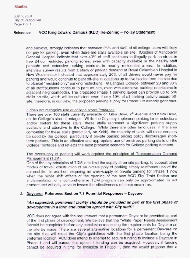 VCC has expressed concern that the Policy Statement seeks to ensure that an expanded, permanent daycare facility be implemented as part of the first phase of development. Whilst the College supports the principle of providing the facility as part of Phase 1, it is concerned that it cannot guarantee that Provincial funding will be made available to achieve this.Staff acknowledge the difficulties facing the College in achieving Provincial funding for the daycare but nevertheless consider that the provision of a permanent, expanded facility within Phase 1 is an important objective to meet amenity needs. Staff are supportive of the College in its efforts to achieve Provincial funding for the facility.