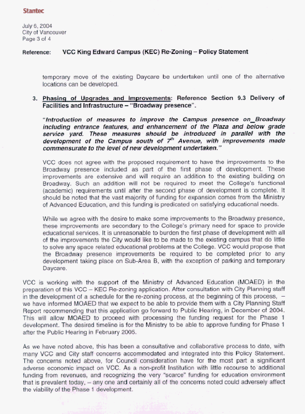 VCC has expressed concern that the Policy Statement seeks to ensure that measures to improve the presence of the campus on Broadway are implemented as part of the first phase of development. Whilst the College acknowledges the need for such measures, it is concerned that it cannot guarantee that funding will available to implement them within Phase 1.Staff acknowledge the difficulties facing the College in achieving funding for these measures, but nevertheless consider that the improvement of the campus Broadway presence is a key urban design objective which should be implemented with the first significant level of new development on the site. Staff are however prepared to be flexible over how increased presence on Broadway is achieved within Phase 1 and to consider how enhancement measures can be phased in a manner which is commensurate with the level of new development taking place on the campus south of 7th Avenue.