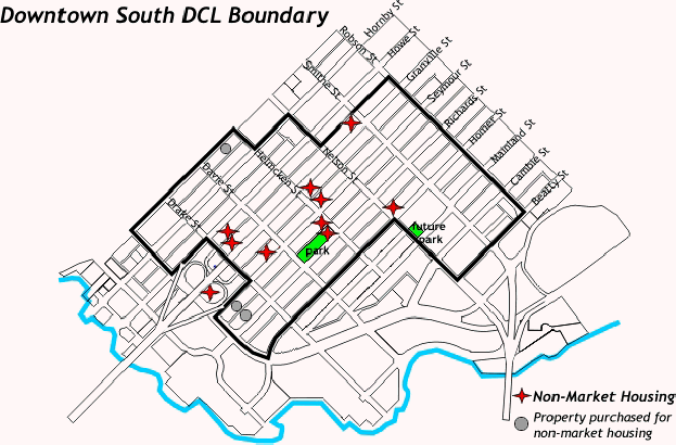 In 1991, there were about 1,400 SRO units in the Downtown South. Since then 688 SRO units have been lost, and seven non-market projects have been completed (and another in process) that will add 660 low-income units. There have been a total of six low-income housing projects that have been targeted for DCL funding. These projects include 1221 Seymour and 1265 Granville Street which are both completed, and the Granville Hotel which is under renovation as well as sites that have been acquired at 1321 Richards, 1324 Seymour and 1134 Burrard Street.