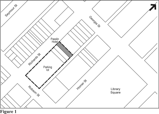 Site: The site at 788 Richards Street is located at on the northeast corner of Richards and Robson Streets in Downtown South as noted on Figure 1. (Lots 9-11, Block 55, DL 541, Plan 210 and Parcel G, Block 55, DL 541, Plan BCP5830). The site has a frontage along Richards Street of 300 ft. and a depth of 120 ft., for a total area of 3 341.73 m² (35,971.3 ft.²). The northerly portion of the site is occupied by the Passlin Hotel, situated at 746 Richards Street, a rooming house licensed for 43 rooms. The City's 2003 survey of low-income housing in the downtown indicated that 40 rooms were in use. A smaller building exists immediately adjacent to the Passlin, to the south, with commercial at grade and two residential units above. The remainder of the site is used for surface parking.