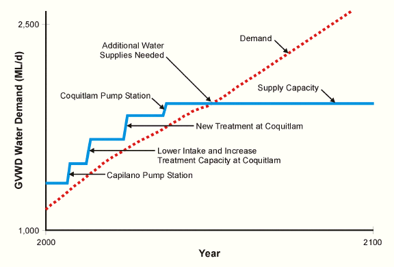 The GVWD has identified a number of upgrades that will increase the amount of water that is available from its current reservoirs. They are: a pump station at Capilano (already underway), a lowered intake and increased treatment capacity at Coquitlam, a new treatment facility at Coquitlam, and finally a new pump station at Coquitlam. The following figure illustrates how each of these actions will improve the available supply capacity. The figure also shows the expected increase in regional demand for water and when that demand will exceed supply.