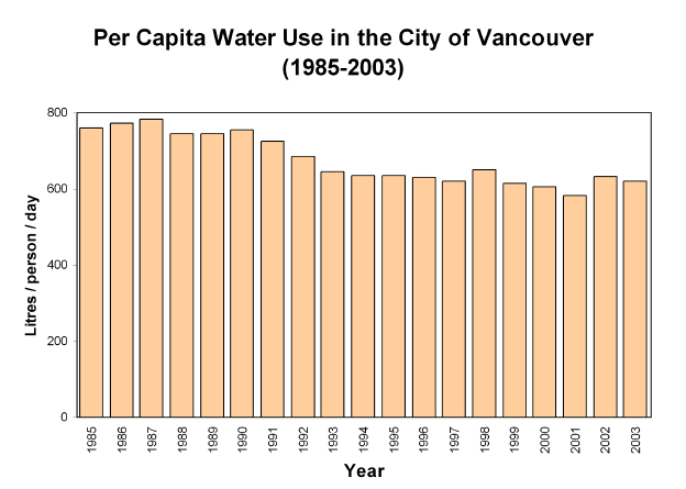 In addition to the policies to encourage high-density housing, the historical decrease in Vancouver's per capita consumption is due in large part to our existing water conservation program.