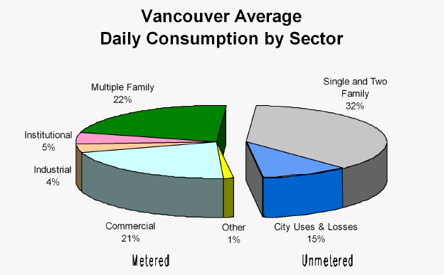 In 2003, Vancouver consumed 133 million cubic metres of water, or one third of the volume supplied by the GVWD. (See Appendix B for a breakdown of water use in Vancouver by sector). Vancouver's population is still increasing but at a much reduced rate in comparison to other municipalities in the region. Furthermore, unlike the rest of the region, Vancouver's number of single-family and duplex housing units is declining, with almost 61% of the residential buildings having three units or greater. This trend has implications for water consumption as per capita outdoor use declines and summer peak demands are reduced.