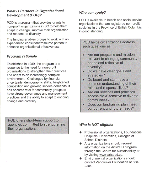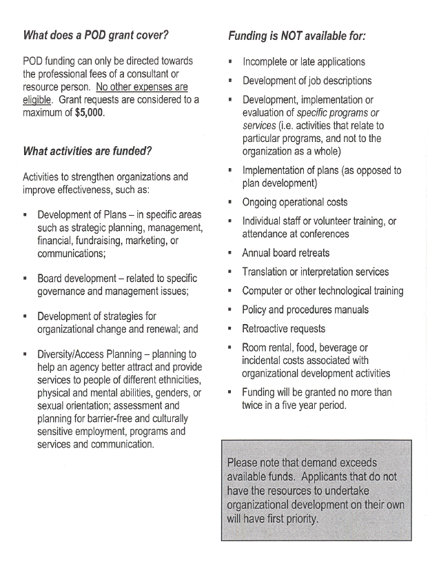Partners in Organizational Development grants are exclusively for hiring a consultant to assist non-profit community services agencies with organizational development activities including Board Development, diversity and access planning, and development of plans such as strategic, fundraising, financial, communications, and marketing. A copy of the 2004 POD brochure describing the program, eligibility and evaluation criteria is attached as Appendix D. Proposals are assessed on the basis of completeness of the application, eligible activities and costs, documented need, a clear activity plan and the long-term benefit to the organization as a whole. A committee of staff representing each funder reviews the POD Grant applications.