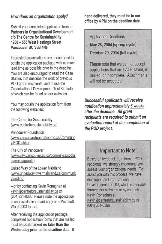 The Partners in Organizational Development Grants program is a multi-funder initiative started in 1989 as a partnership of the Vancouver Foundation, United Way of the Lower Mainland, the Department of the Secretary of State and the City of Vancouver. The aim of this grant program is to help non-profit groups deal with common organizational problems and thus to function more effectively. The 2004 POD program funding partners are: United Way of the Lower Mainland, Vancouver Foundation, and the City of Vancouver. The Centre for Sustainability administers the POD Grants Program on behalf of the participating funders. This involves marketing the grant program, co-ordinating POD funder meetings, compiling mailing lists, distributing applications, mailing out cheques, providing letters to unsuccessful applicants, and securing project evaluation reports due at the end of each year from grant recipients. They will receive a 6% administration fee from the partners as reimbursement for these services.