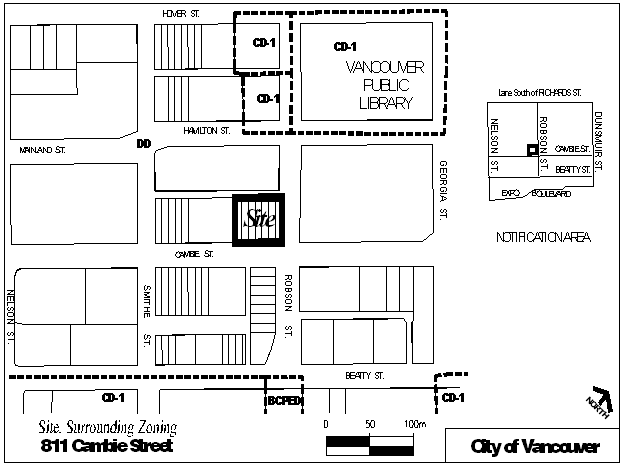 Site and Context: The site is located at the southwest corner of Robson and Cambie Streets. (See Figure 1). It is presently a vacant lot providing surface parking. It has a frontage of 36.6 m (120 ft.) on Robson Street and 53.3 m (175 ft.) on Cambie Street. There is a building line of approximately 4.3 m (14 ft.) on Robson Street, requiring dedication to the City of this portion of the site.