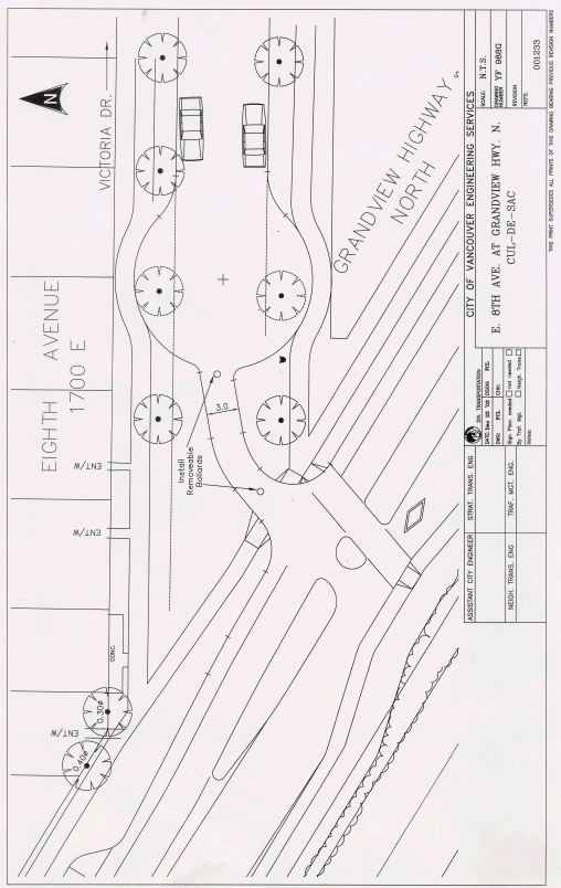· The cul-de-sac is essential to providing a barrier to the bus loop on Grandview Hwy. N. and lights/noise of the Sky Train. If the cul-de-sac is not approved, 8th Avenue will become a shortcut route around Broadway & Commercial Dr. intersection. The cul-de-sac was part of the deal brokered by Engineering with residents in 2002 so that the community would have a sense of privacy, the greenway could be densely planted, and the City could maintain the bus loop, add a westbound shortcut off of Broadway to North Grandview Hwy, and put in 3 meter wide paths in the south side of North Grandview Hwy. City Council (in 2002) supported this plan.