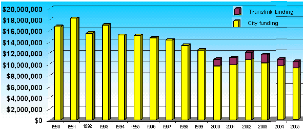 Streets Operating Budget (adjusted for inflation)As part of the long range plan we will be analyzing and recommending an appropriate course of maintenance and replacement. However, at this time, we feel that it is prudent to get started on a modest maintenance program to deal with some of the most pressing needs. Therefore, we are recommending an increase to the Streets Operating Budget of $685,000 for now. This funding allocates approximately $100 of maintenance work per residential street block. This is quite small compared to the existing arterial maintenance funding of over $3,000 per block.