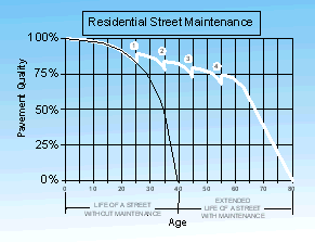 The following graph shows schematically the series of maintenance treatments required over a streets life and how the life of the pavement can be extended. That is, for a typical residential street a maintenance program would first consist of crack filling the street around the 25th year, then cut-out & patch near the 35th year, crack fill again near the 45th year, and finally a combination of cut-out & patch and chip seal around the 55th year to extend the life cycle of the street upward of 80 years.