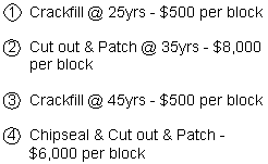 The reconstruction cost of one residential block with asphalt is about $50,000 with a design life of 40 years if no maintenance is performed. The life expectancy can be doubled if a proper maintenance program is implemented at approximately $15,000 or 30 percent of the reconstruction costs at today's value.