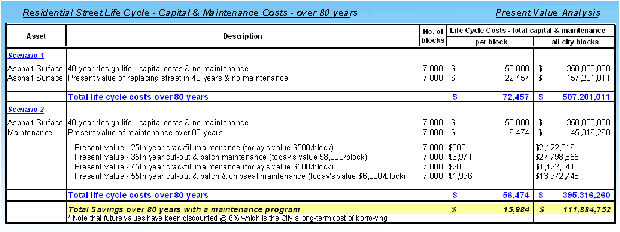 The following table is a present value analysis of the life cycle costs of a residential street over eighty years both with and without appropriate maintenance. The table clearly shows it is cost effective to do appropriate maintenance over the life of a pavement. Extending the costs over the entire inventory of residential streets shows a present value savings of nearly $112 million dollars.