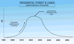 The following graph schematically shows the maintenance effort that would be necessary on our residential street and lane system in the coming years. Because construction of these streets occurred over a relatively short time, the maintenance effort required can be expected to rise sharply rather than being constant.