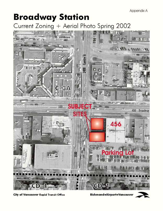 This report discusses the integration of the entrance to the Broadway RAV station with the adjacent City-owned property on the east side of Cambie between Broadway and 10th Avenue. The report identifies and reviews five relevant criteria including bus connections with the station, pedestrian access and safety, public realm commitments, redevelopment of the civic precinct and heritage conservation. The report concludes that various options exist to integrate the existing heritage building into the site but that all options compromise some or all of the above criteria. Weighing the various options against the criteria, staff recommends, as the preferred option, one which facilitates pedestrian access between Broadway buses and RAV which, unfortunately requires the demolition of the four retail units along Broadway immediately east of Cambie and the "B" listed Heritage apartment at 2530 Cambie.