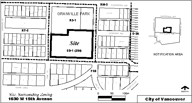 Site, Surrounding Zoning and Development: This 14 217 m² (153,036 sq. ft.) site is comprised of a single parcel located on the north side of West 16th Avenue. The site has a frontage of 152.64 m (500.8 ft.) along its north boundary, a frontage of 82.24 m (269.6 ft.) along Pine Street, and a frontage of 100.43 m (329.5 ft.) along Fir Street.