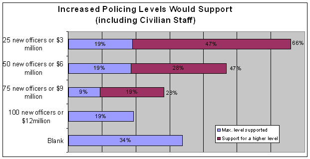 The results indicate that most (66% in total) of the respondents would be in favour of at least an increase of 25 new officers at a cost of $3 million. 47% would also support a new expenditure of $6million for 50 new police officers and related civilian staff.