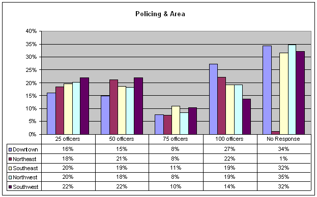 An interesting note to make is that when the results of the additional number of officers that were preferred, were compared to the area that the respondents came from, there was a clear indication that the downtown area respondents strongly supported additional 100 new officers.