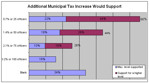 86% would accept a 2% tax increase, 72% would accept a 4% tax increase, while 59% would accept a 6% tax increase.In 2005, a number of new questions were added to the survey to obtain input from public on the new revenues and savings available to the City in 2005 and priorities around policing resources. These include: