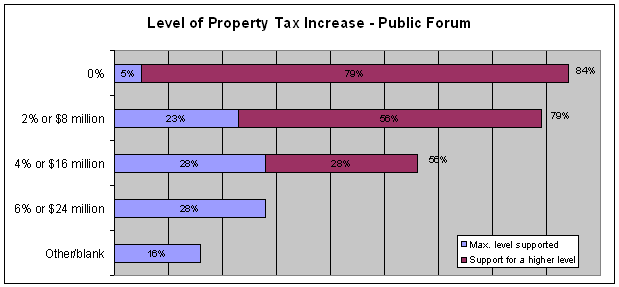 If we extract the results from just the public forum respondents, it indicates that most (84% in total) of the respondents would be in favour of a 0% increase in property tax levels. A majority (79% in total) would also support a 2% increase in property taxes. However, 56% of the respondents would not be against a 4% increase in property taxes.
