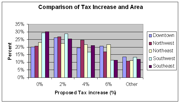 When comparing the various areas that the respondents live in to their choice of preferred tax increase, the conclusion is that all areas support a 2% increase to taxes.