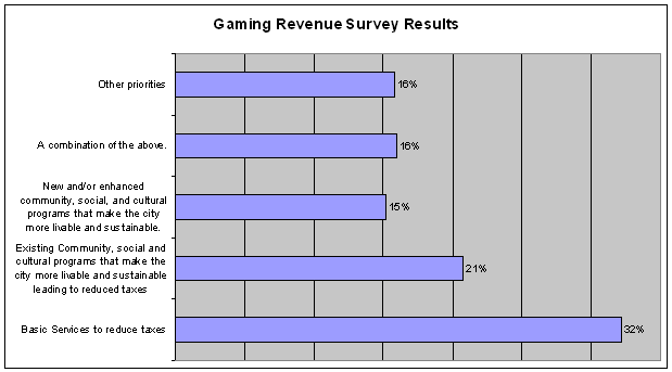 The survey asked how residents would like to utilize the additional gaming revenue. 53% chose to reduce taxes (32% would apply to basic services and 21% would apply to existing community services and cultural programs) while 15% preferred to enhance or add new community services and cultural programs.Once again there seemed to be a difference in results from those that attended the Mayors meetings. 47% chose to reduce taxes (10% would apply to basic services and 37% would apply to existing community services and cultural programs) while 25% preferred to enhance or add new community services and cultural programs
