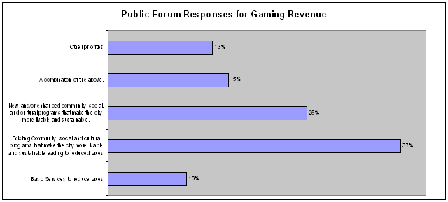 However, if the results from only the public forums were extracted, the results would indicate that 37% of the respondents from the public forums would prefer the gaming revenues to be used to fund existing programs leading to reduced tax rates. While 25% showed a preference to utilize the revenue to fund new and/or enhanced community, social, and cultural programs.