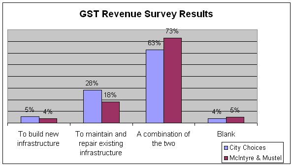 An overwhelming response from the City Choices survey of 63% of the respondents would support a combination of building new infrastructure as well as maintaining/repairing existing infrastructure. Interesting point to note is that the Mustel Group telephone survey had similar results of 73% in favour of the GST cost savings being applied to a combination of the two choices.